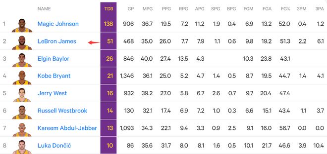 4.詹姆斯湖人队史第51次三双仅次于魔术师138次;